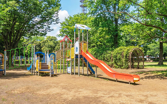 複合遊具や砂場があり、小さなお子様が安心して遊べるエリアです。