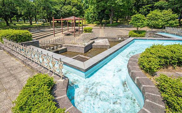夏は噴水やせせらぎで水遊びが可能。家族連れに人気のクールスポット♪