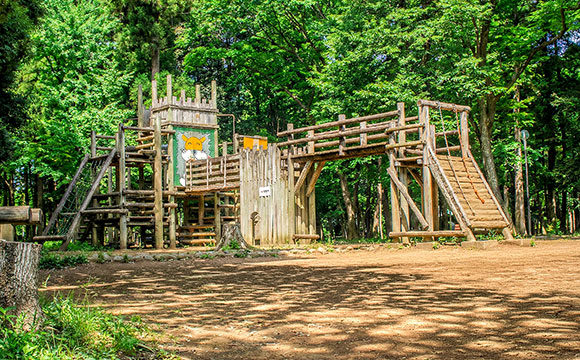 自然林を活かした木製アスレチック「冒険とりで」が目玉のエリアです。