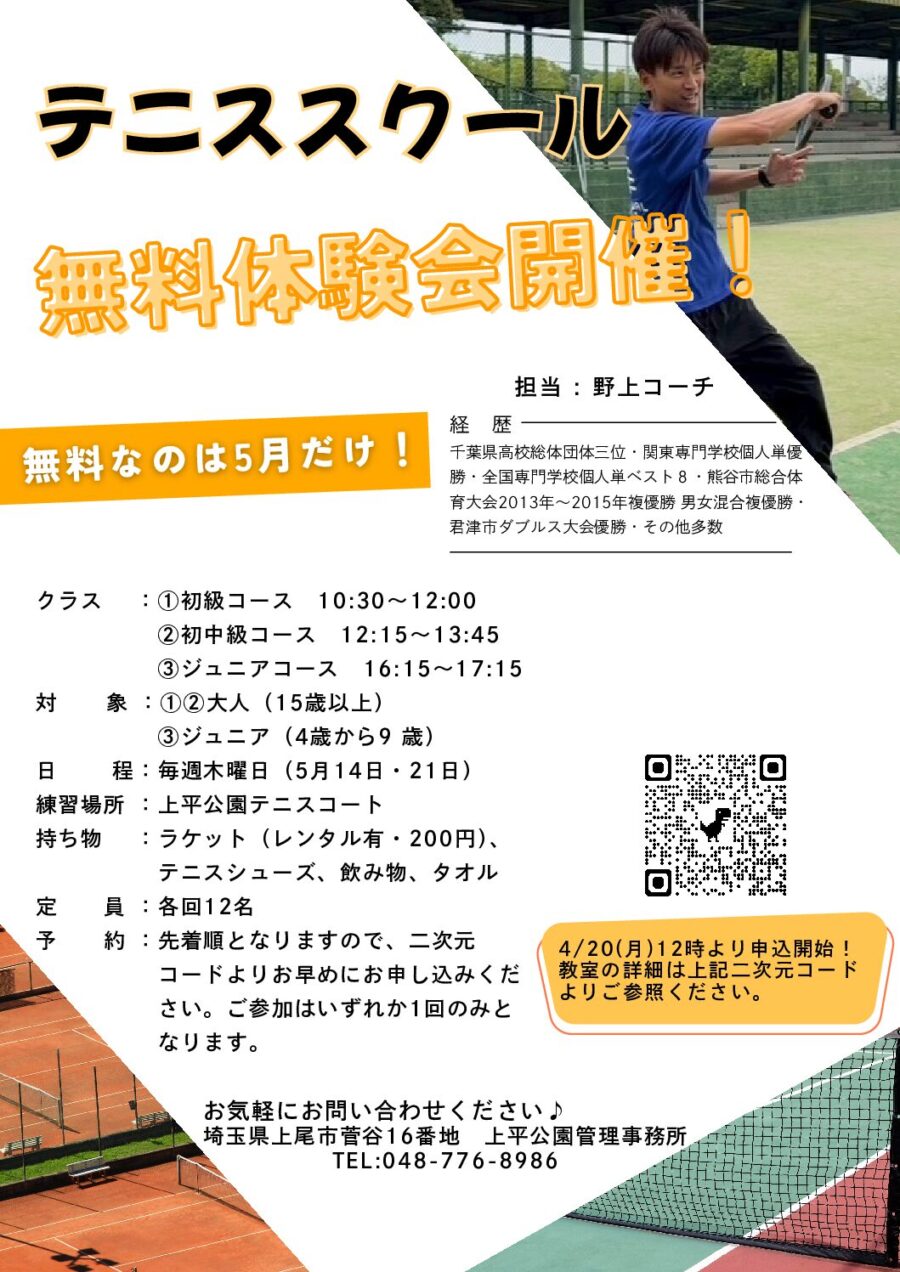 テニスコートにて、テニススクールの無料体験会を開催いたします。初級コース・初中級コース・ジュニアコースの3クラスをご用意しておりますので、ご自身のレベルに合わせてご参加ください。